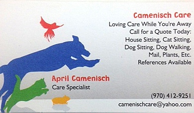 Camenisch Care is something I do for fun and a little extra money. Prices are based on a number of things including distance from my work, type of pet, number of pets, and your pet(s) schedule. I usually will come meet your pet(s) and then provide a price. Please email at camenischcare@yahoo.com if you need some temporary pet/house care. I have references available.